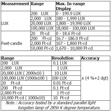 2.测量范围: 0.1~100000LUX/0.1~10000FC