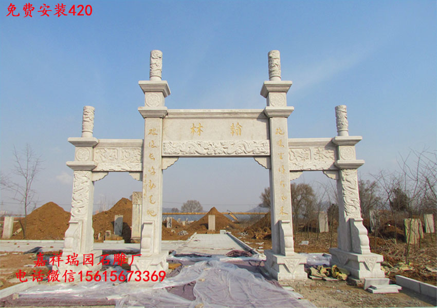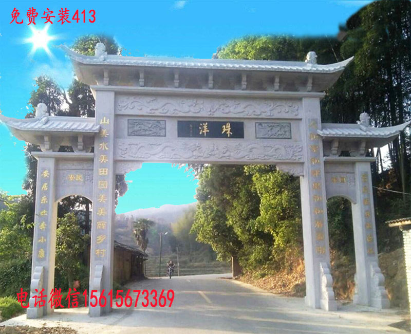 农村牌坊制作样式及村口门牌楼图片大全;农村石牌坊和牌楼是我国农村表达人生理念的重要载体,用于标榜功名、村门标志、道德教化、情感承载等,是农村重要的空间标识。农村牌坊图片样式从质地上分,有木牌坊、花岗石牌坊、大理石牌坊、青石牌坊、汉白玉石牌楼、等类型。从农村牌坊雕刻制作形式上分,有一间两柱一楼样式的单门牌坊、一间两柱三楼样式的单门牌楼、三间四柱三楼的石牌坊、三间四柱七楼样式的复杂石牌楼、三间四柱九楼的石牌楼、五间六柱五楼样式的牌坊、五间六柱十一楼样式的石牌楼等。