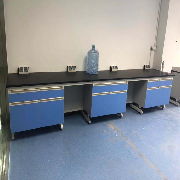 shiji架:采用E1级18mm厚一次成型板,2mm厚PVC高温热压封 边防水处理;II、与实验台框架一体,搁板为平板钢化玻璃板,设有防滑措施,并可调节高度。