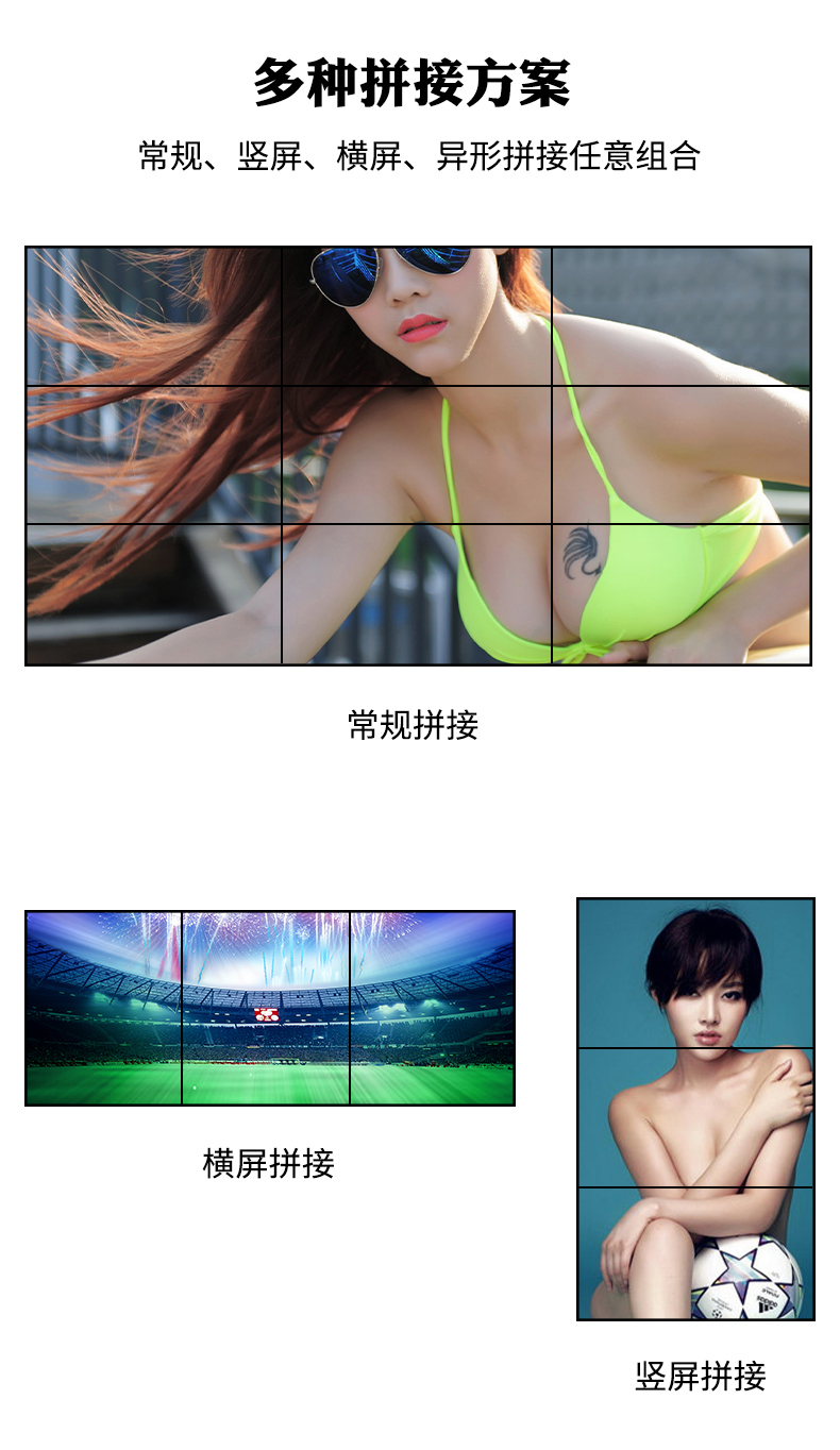 本公司生产三星、LG液晶拼接屏、京东方拼接屏、华星光电拼接屏、46寸、49寸、55寸、65寸液晶拼接大屏幕、触摸拼接屏、led拼接显示屏、lcd液晶拼接大屏、液晶显示大屏、无缝拼接屏,价格公道,服务好,质量保证。欢迎订购。专注于液晶拼接,大屏幕拼接,广告机,安装与销售。