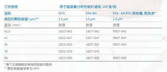 固含量, 包括 • 总悬浮物 • 总溶解性固体 • 总挥发性固体 | GF/C 934-AH 玻璃纤维滤纸 | • 符合标准方法的要求 GF/C 符合 EN 872 ( 图 2 ) ; 934-AH 符合标准方法 2540D • 高负载能力,可过滤非常浑浊的样品 • 可保留非常细的颗粒 |