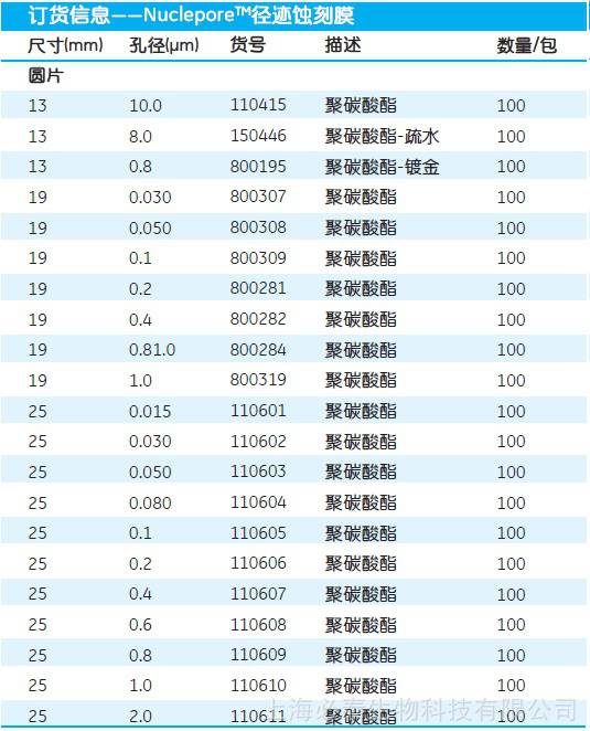 径迹蚀刻膜(核孔膜)由Whatman先进技术生产,包括NulcleporeTM和CycleporeTM聚碳酸酯膜、趋药性膜、黑色核孔膜和细胞培养膜等。径迹蚀刻膜(Track-Etched Membrane)圆柱形孔贯穿膜基体,能够精确截留,膜表面光滑平整,方便显微镜表面观察。径迹蚀刻膜由纯聚合物制成,亲水性好,还提供疏水性膜。化学洁净度好,不含污染物或杂质,皮重zui轻、吸水量zui小和极低的非特异蛋白吸附,它耐受盐酸和硝酸、醇、醚、环己烷等,广泛化学兼容性非常适于检测许多腐蚀性及有机液体中的颗粒物。