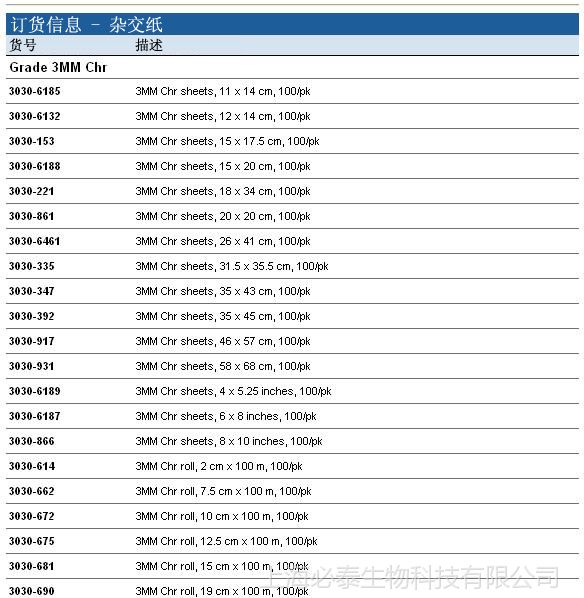 尽管常被用作杂交滤纸,但是3 MM Chr还可以用于电泳和普通化学。中等厚度(0.34 mm),被广泛用于层析和电泳,流速130 mm/30 min,还可作为呼吸机湿热交换器的关键介质。