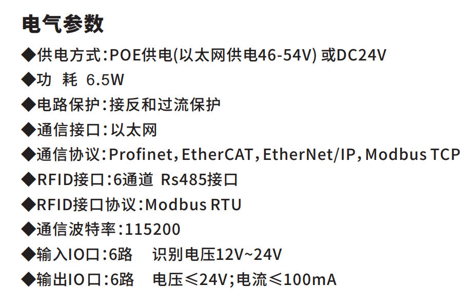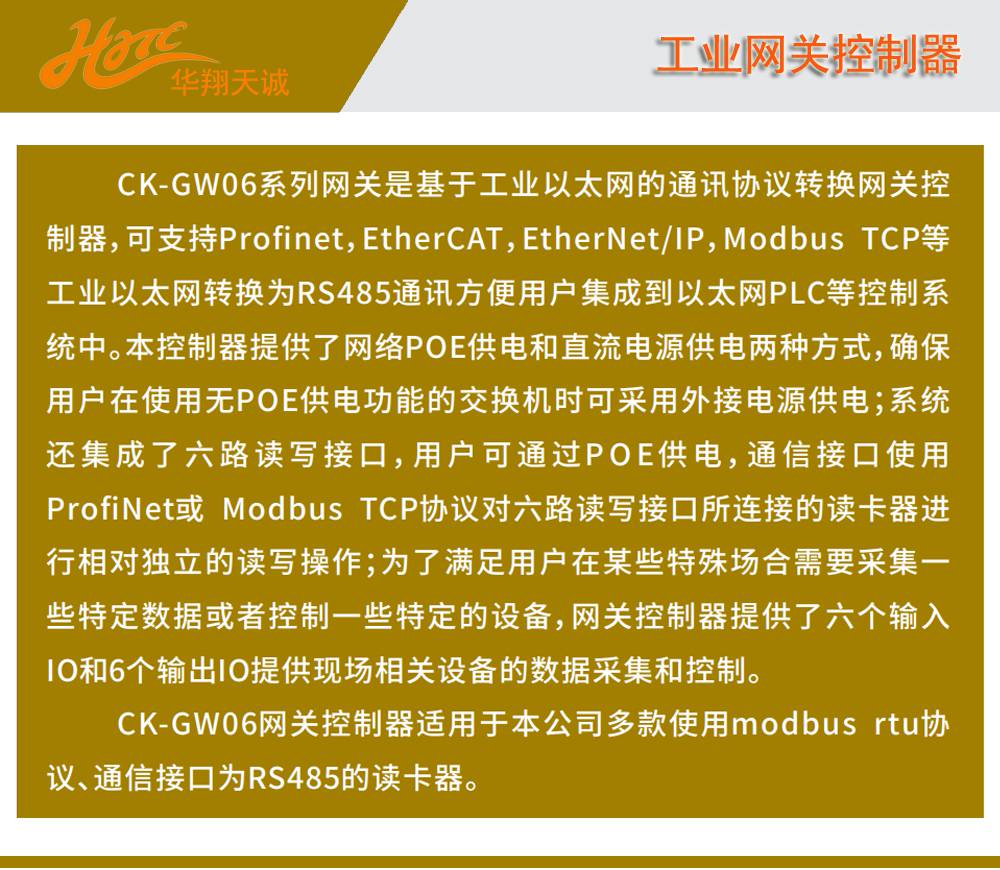 CK-GW06系列网关是基于工业以太网的通讯协议转换网关控制器,可支持Profinet,EtherCAT,EtherNet/IP,Modbus TCP等工业以太网转换为RS485通讯方便用户集成到以太网PLC等控制系统中。本控制器提供了网络POE供电和直流电源供电两种方式,确保用户在使用无POE供电功能的交换机时可采用外接电源供电;系统还集成了六路读写接口,用户可通过POE供电,通信接口使用ProfiNet或 Modbus TCP协议对六路读写接口所连接的读卡器进行相对***的读写操作;为了满足用户在某些特殊场合需要采集一些特定数据或者控制一些特定的设备,网关控制器提供了六个输入IO和6个输出IO提供现场相关设备的数据采集和控制。