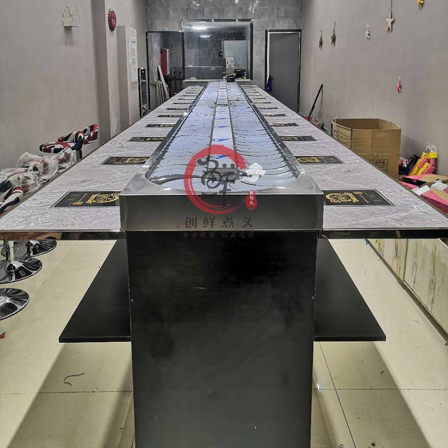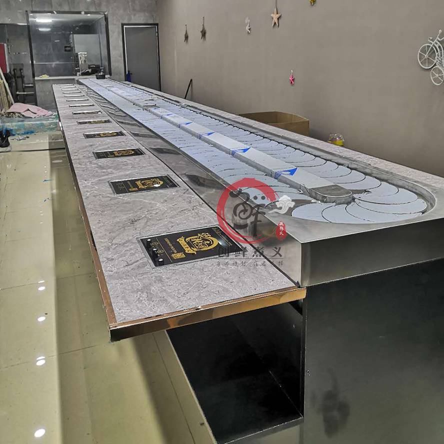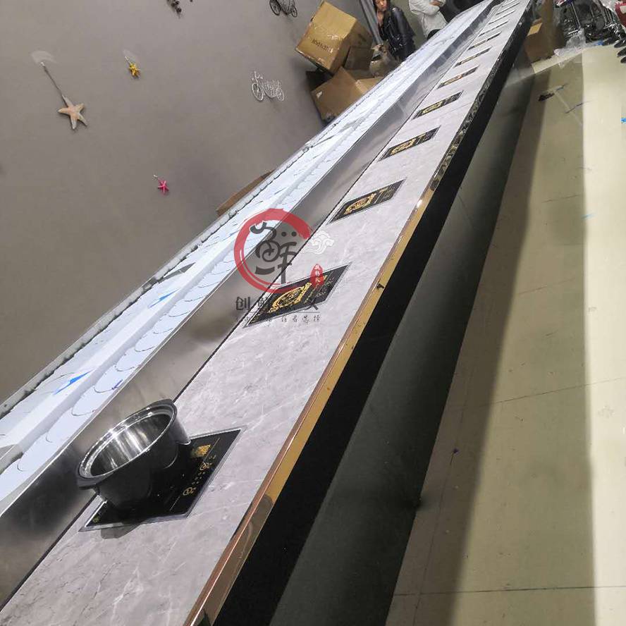 主要采用304不锈钢材质和工程塑料等美观 卫生的材料制造而成,输送链板采用304不锈钢制造,输送方向,速度任意可调,是各种自助火锅,自助早餐的时尚设备。采用苏亮等荷叶片,变频器采用220V,2HP-系列,线速2-8米/分钟可调,伊派电磁炉加热块,纯铜线丝更稳定 .