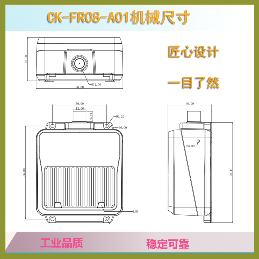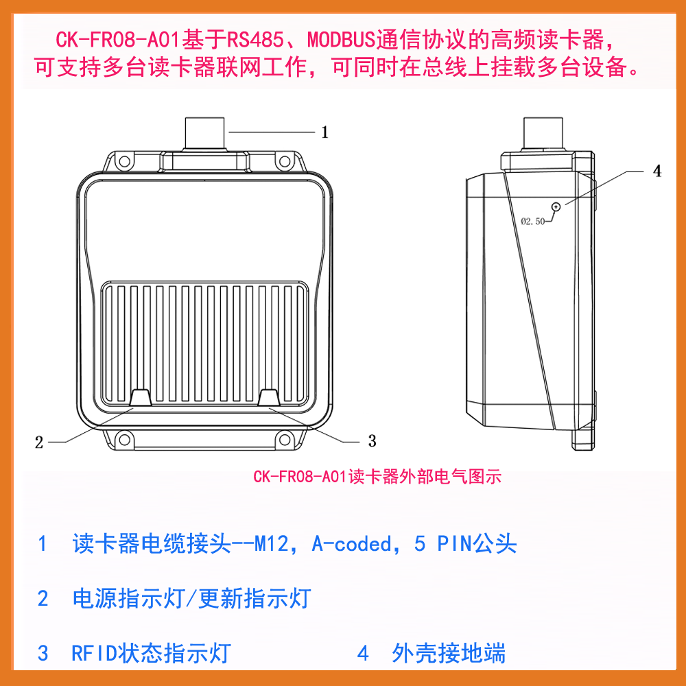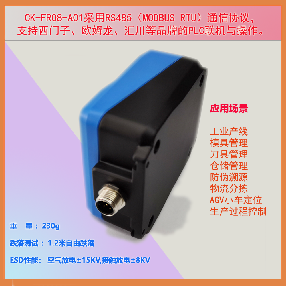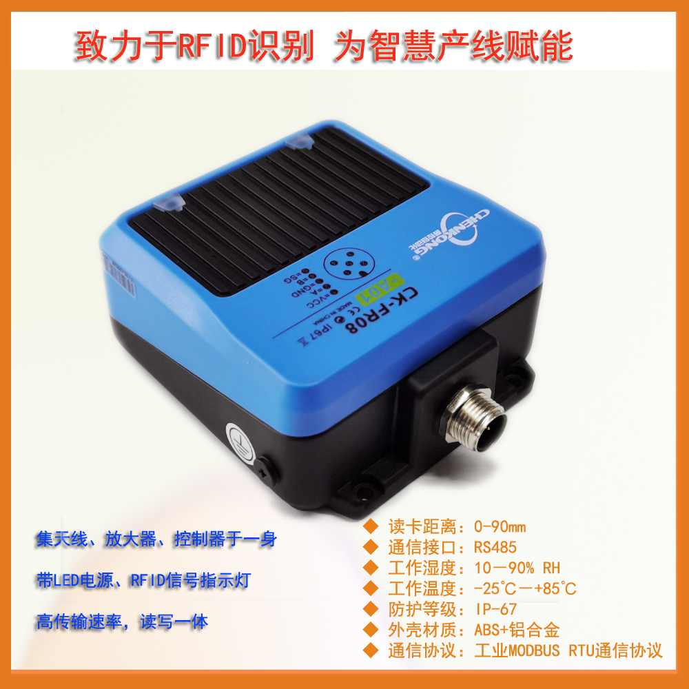 CK-FR08系列方形读写器工作频率为13.56MHZ,是一款集天线,放大器,控制器于一体的3合1型高频读写头,读写头可集成了工业总线型:RS485(Modbus RTU), RS232(Modbus RTU),Canbus(Canopen), IO-Link ,AS-I ;工业以太网型:Profinet,EtherCAT,EtherNet/IP,Modbus TCP等接口方便用户接入不同的控制系统中,用户可根据实际工业应用选择对应的通讯接口。