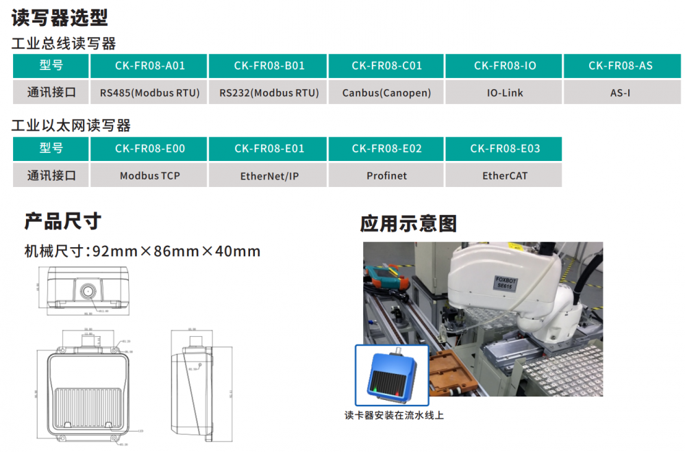 工业以太网读写头 Profinet放大器单元 高频工业读写器 CK-FR08-E02是一款基于射频识别技术的高频RFID标签读卡器,读卡器工作频率为13.56MHZ,支持对I-CODE 2、I-CODE SLI等符合ISO15693国际标准协议格式标签的读取。