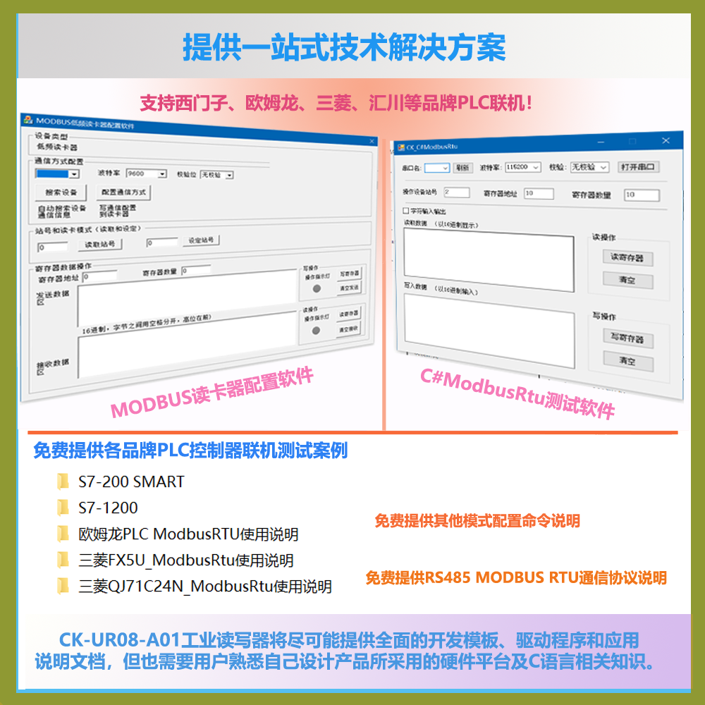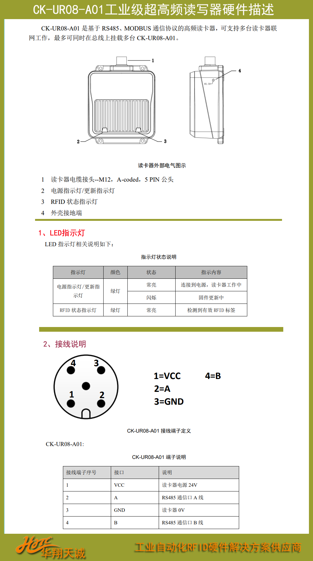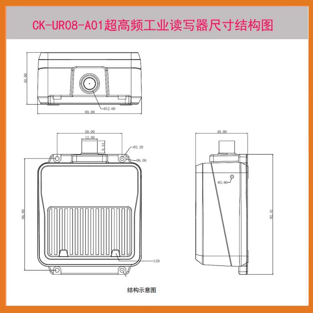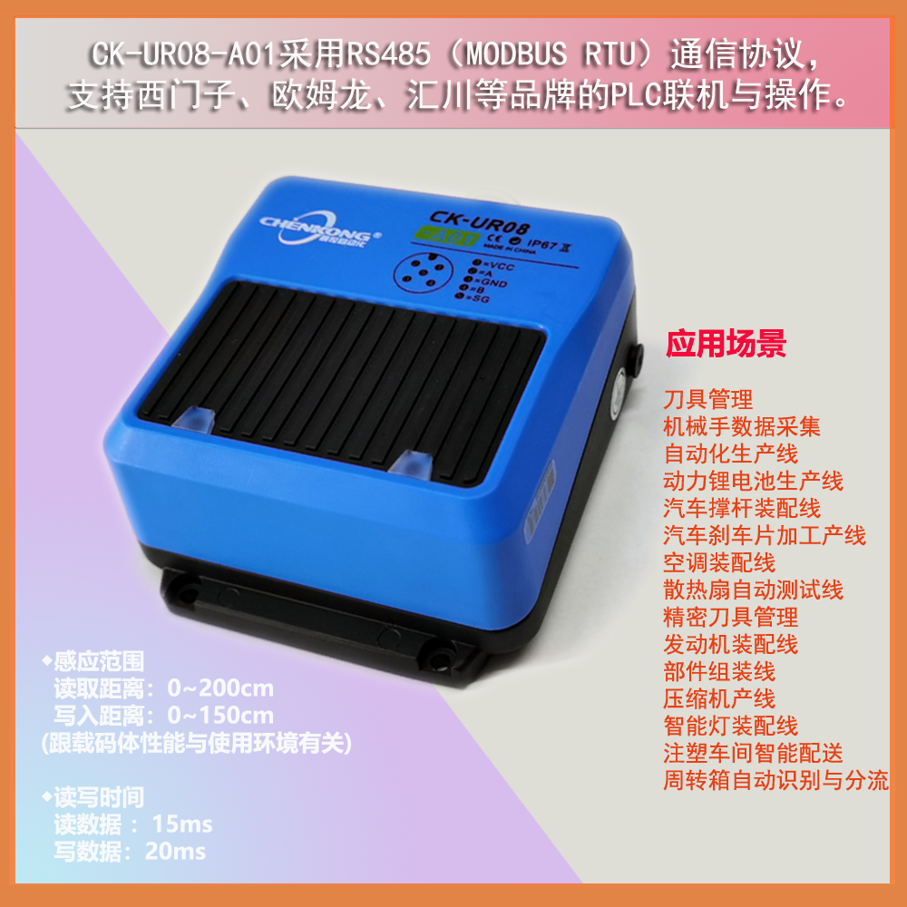 CK-UR08-A01是天线一体式超高频读写器,工作频率为920MHz~925MHz,符合EPC Global Class l Gen 2/IS0-18000-6C标准,输出功率27dBm。读写头支持RS485(Modbus)、RS232(modbus)、Profinet,EtherCAT,EtherNet/IP,Modbus TCP等工业以太网接口(具体通讯协议,请参与具体型号),方便用户接入不同的控制系统中。