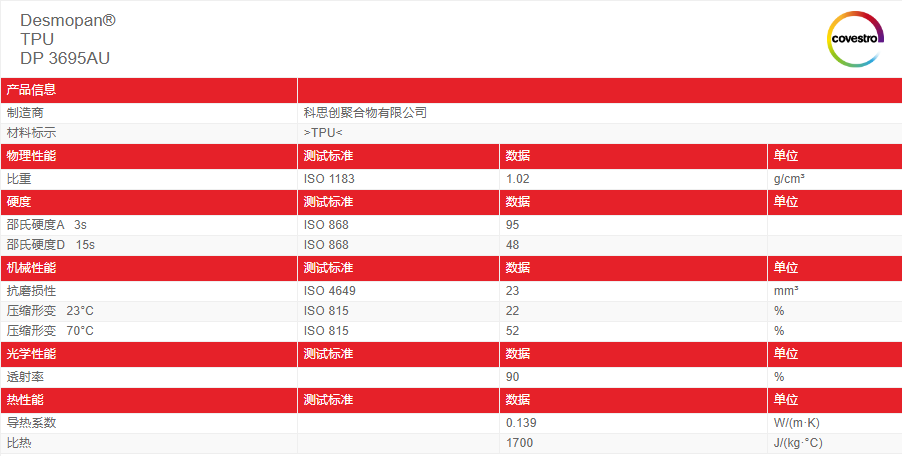 科思创TPU3695AU耐水解耐候级健身器材应用汽车部件应用