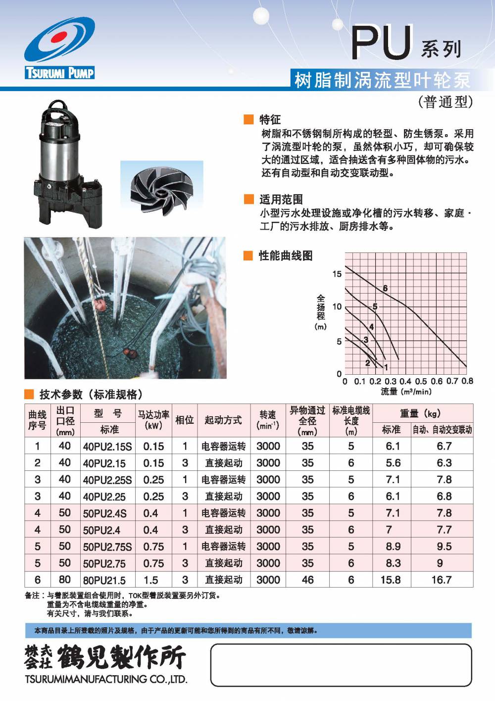 日本鹤见 污水泵 PU系列 旋涡泵叶轮40PU2.15S 不锈钢排污泵 杂质泵