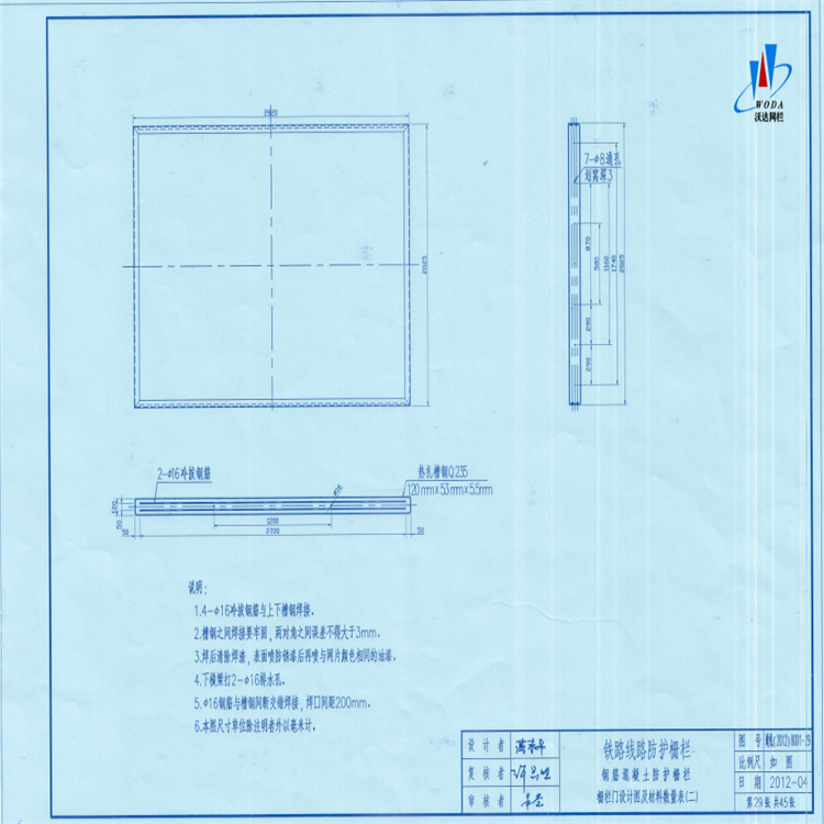 1.门框为C12槽钢(120*53*5.5MM),安装在立柱中间,大门全部采用60*40*3MM方管,网框整体喷***防锈漆,安装后应滑动自如,门锁对称焊接。