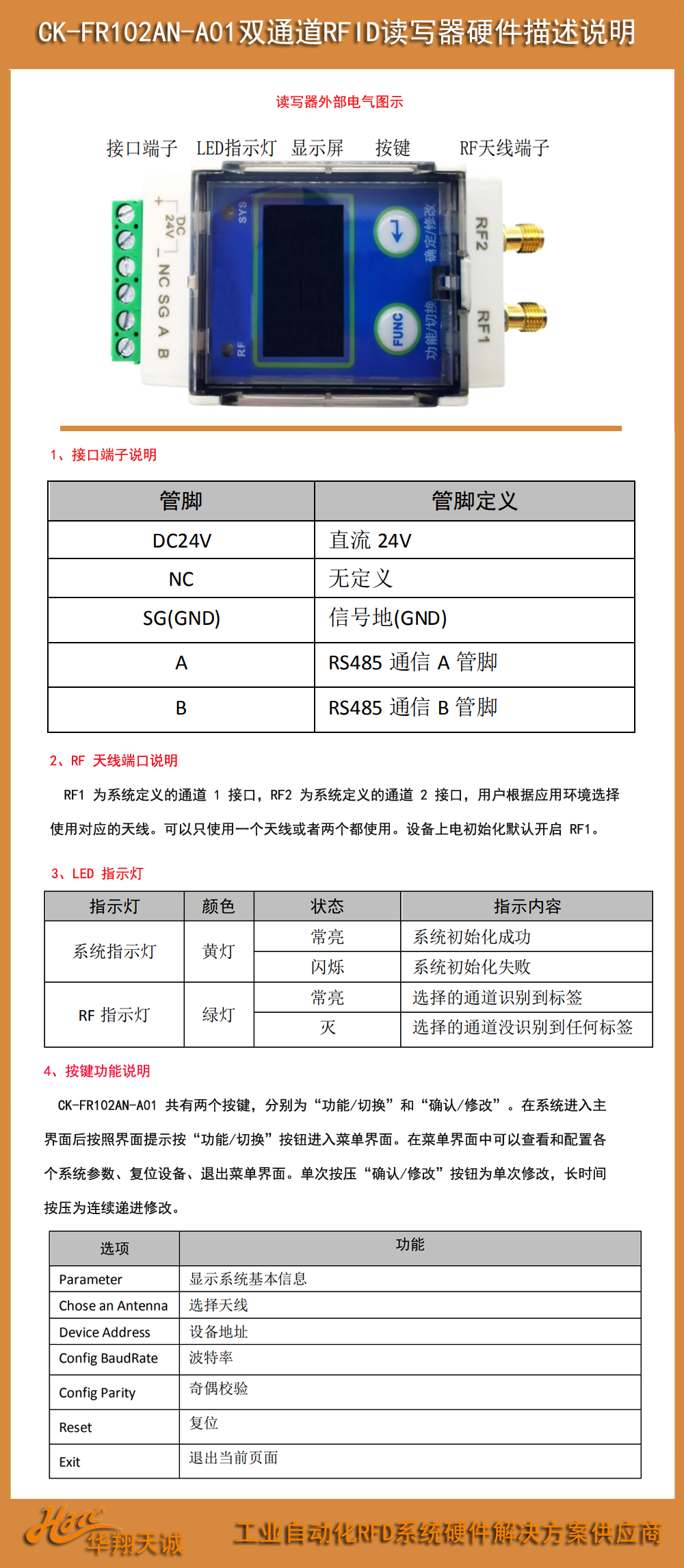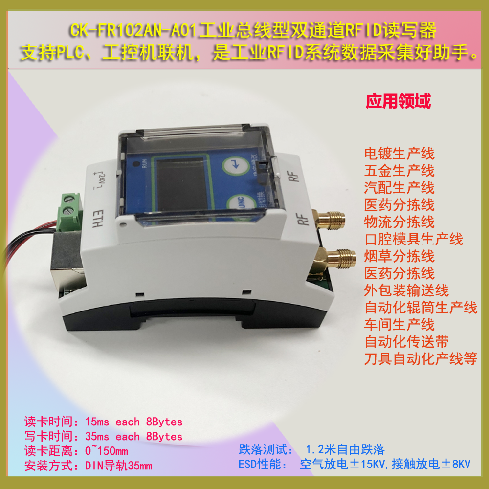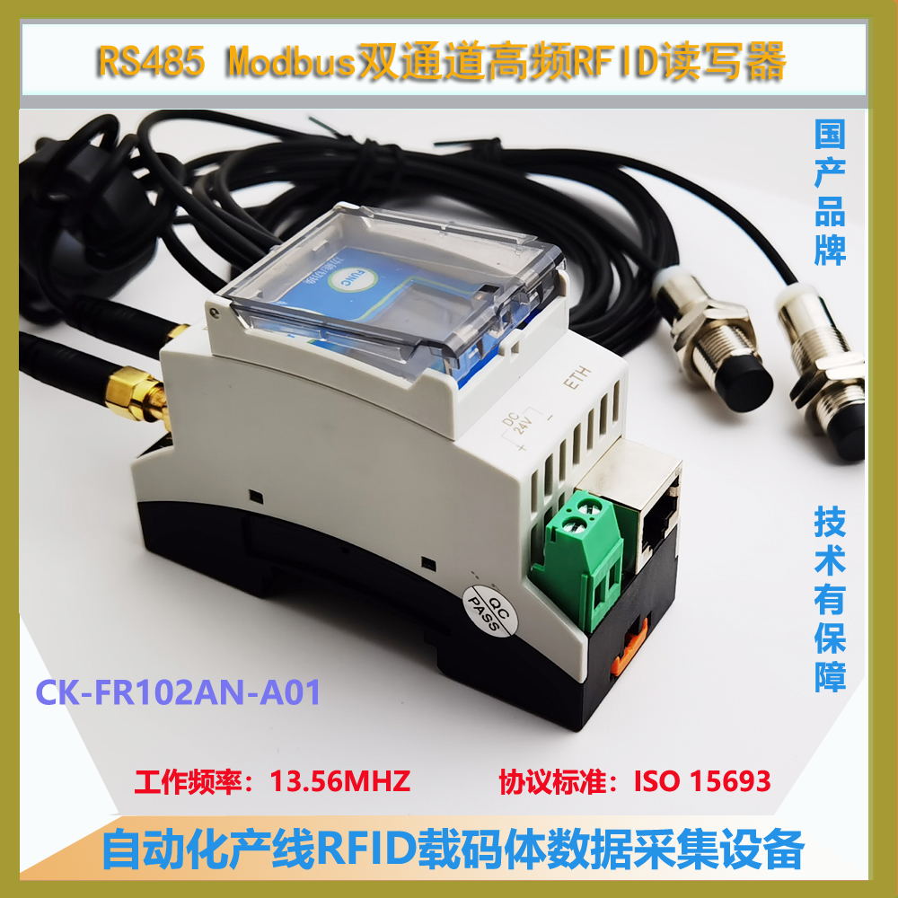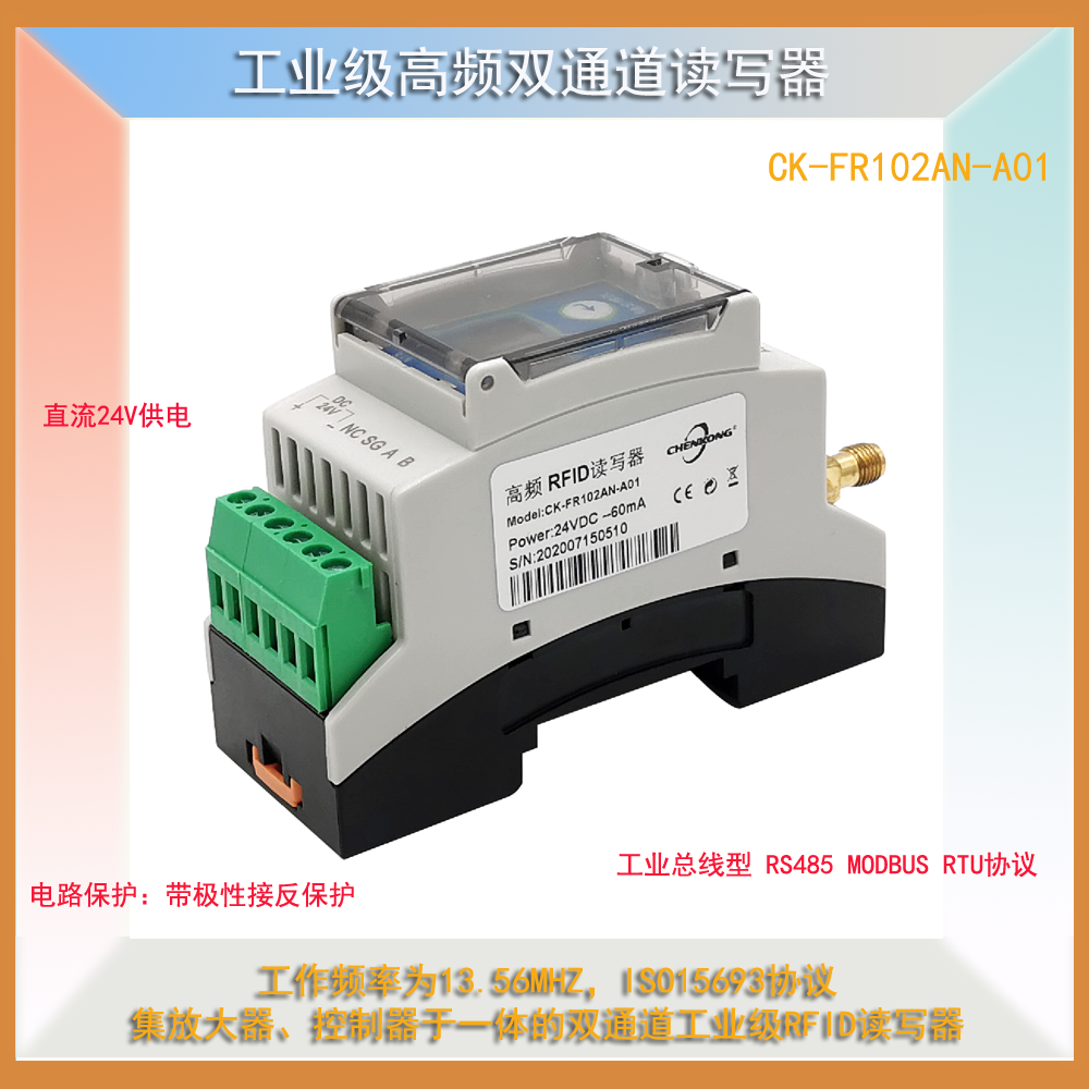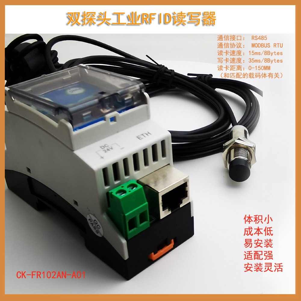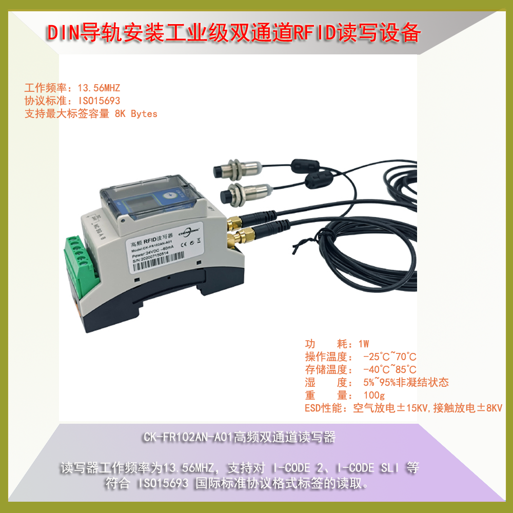 微型铣刀自动化产线双探头RFID读卡器 料盒标签识读器 读写器CK-FR102AN-A01,是一款基于射频识别技术的高频RFID标签读卡器,读卡器工作频率为13.56MHZ,支持对I-CODE 2、I-CODE SLI等符合ISO15693国际标准协议格式标签的读取。