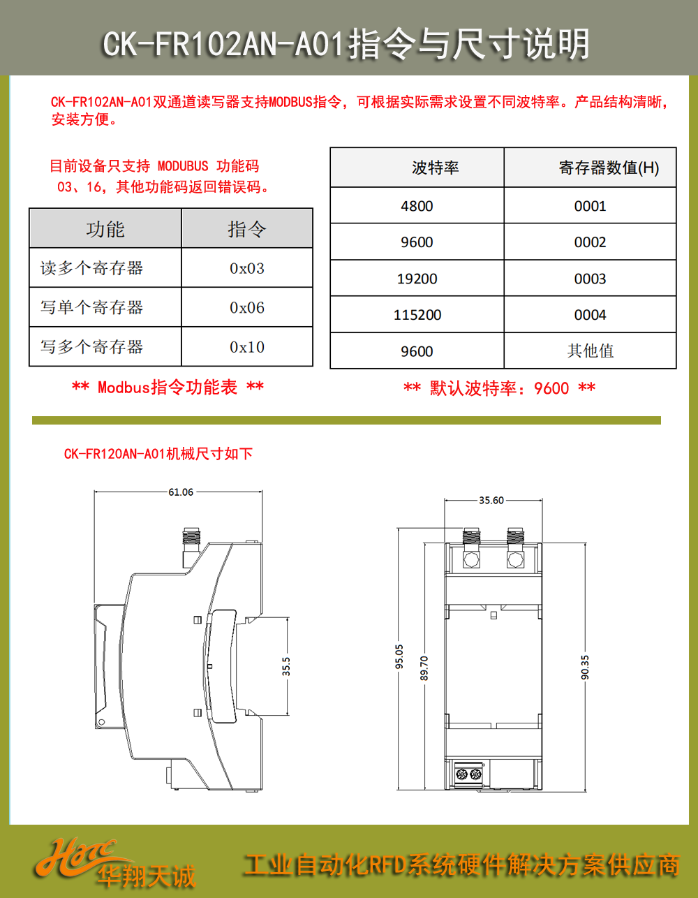 微型铣刀自动化产线双探头RFID读卡器 料盒标签识读器 读写器CK-FR102AN-A01,是一款轻量型RFID读写器,采用聚碳酸酯材质定制外壳,体积小、自带工控箱安装滑轨卡扣,易安装。同时支持两个探头工作,通过电缆拉长的探头在加工机械应用场景上可以灵活安装,支持Modbus RTU、Modbus TCP、Ethernet/Ip、Profinet四种通讯协议。