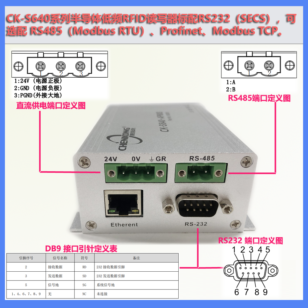 RF低频玻璃棒阅读器 读卡器 读写器支持TI系列标签识别CK-S640-AP60S兼容V640系列,是一款基于射频识别技术的低频RFID标签读卡器,读卡器工作频率134.2kHz。该读卡器支持标准工业半导体SECS协议和 Modbus RTU协议,方便用户应用到半导体加工控制器或PLC等系统中。设备外置了三个模式开关选择器,方便用户直接设置工作模式、通信速率以及设备地址。读卡器内部集成了射频部分通信协议,用户只需通过RS232/RS485通信接口发送接收数据便可完成标签的读取操作,无需理解复杂的射频通信协议。