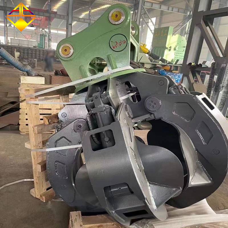 液压回转式抓爪:液压回转式抓爪上有一条液压油缸和一个回转液压马达,需要在原机的基础上添加管路和改装液压系统才可使用的抓爪,液压回转式抓爪可以前后摆动,360度左右回转可以任意调整抓取物的角度,液压回转式抓爪一般都为两爪三爪式(适用于任何挖掘机,液压回转式抓爪属于方便、实用、高成本型抓爪)。