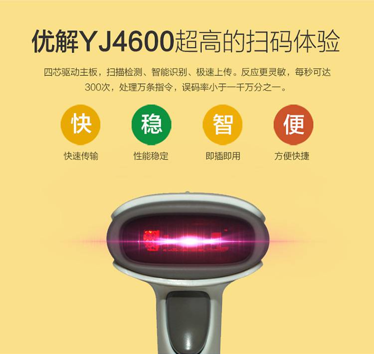 优解YOUJIE YJ4600是一款中低端二维影响扫描器,价格低廉,性能突出,不仅符合***工学设计,而且更优惠实用,可以满足多种场合的应用需求,如果您正在寻找一款高质量,低成本的二维影像扫描器,优解4600将是您的选择!
