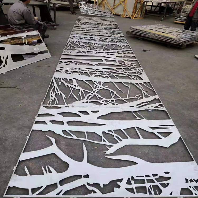 雕花、镂空铝单板是根据设计图纸通过对平板经过裁剪、折边、弯弧、焊接、打磨等工序,把铝单板加工成施工所需的形状和尺寸,其常用厚度为1.5、2.0、2.5、3.0mm,型号为1100、3003,状态为H24。