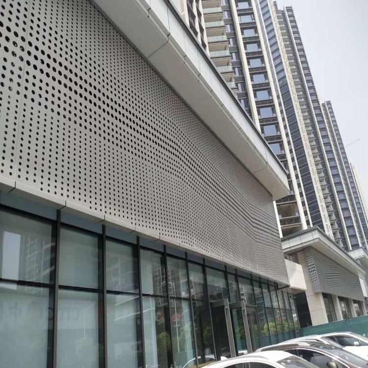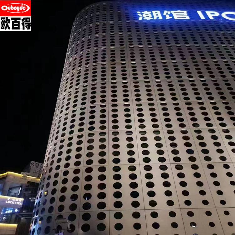 冲孔铝单板采用厚度在1.5、2.0、2.5、3.0mm,材质为1100,3003纯铝为基材,通过数控加工而成的金属冲孔铝单板,铝单板抗腐蚀,承重力强,抗拉强度高,大小疏密的孔形变换搭配使铝单板板面产生动感,种类多样。 颜色、孔型、冲孔率等的设计可按需定制,满足客户的个性化需求。