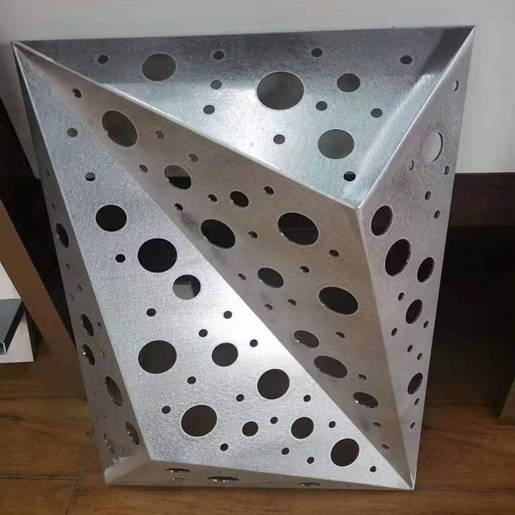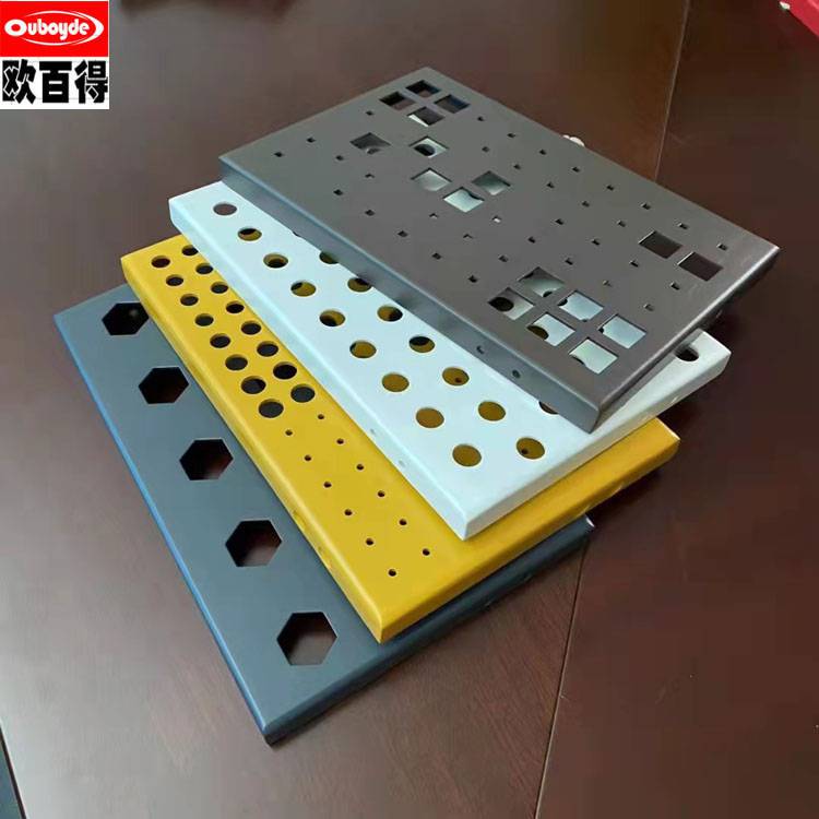冲孔铝单板是根据设计图纸通过对平板经过裁剪、冲孔、折边、打磨、喷涂等工序成型。冲孔铝单板是一种细化产品,除了具有各种优势之外,还有很好的加工性能。冲孔铝板通过剪裁为适合尺寸,在全数控冲床上进行穿孔。可冲圆孔、方孔、棱形孔、三角孔、五角星孔、长圆孔等其他孔形均可定制,利用这些大小不等孔和明暗视觉效果,为设计人员提供了良好的设计想象空间,从而设计出各种线条、图案。
