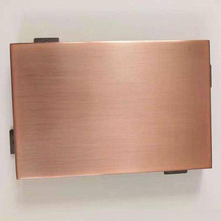 拉丝铝单板采用高强度铝合金板材,其常用厚度为1.5、2.0、2.5、3.0mm,材质为1100、3003,状态为H24。拉丝铝单板其构造主要由面板、平衡筋和角码组成。角码可直接由面板折弯成型,也可在面板的小边上铆装角码成型,平衡筋与板面后的电焊螺钉(螺钉是直接焊在板面背面的)连接,使之成为一个牢固的整体,极大增强了铝单板的强度与刚性,拉丝铝单板保证了长期使用中的平整度及抗风抗震能力。拉丝铝单板实用性和装饰性都特别好,在装修市场上的应用也比较广,深受广大客户的喜爱。