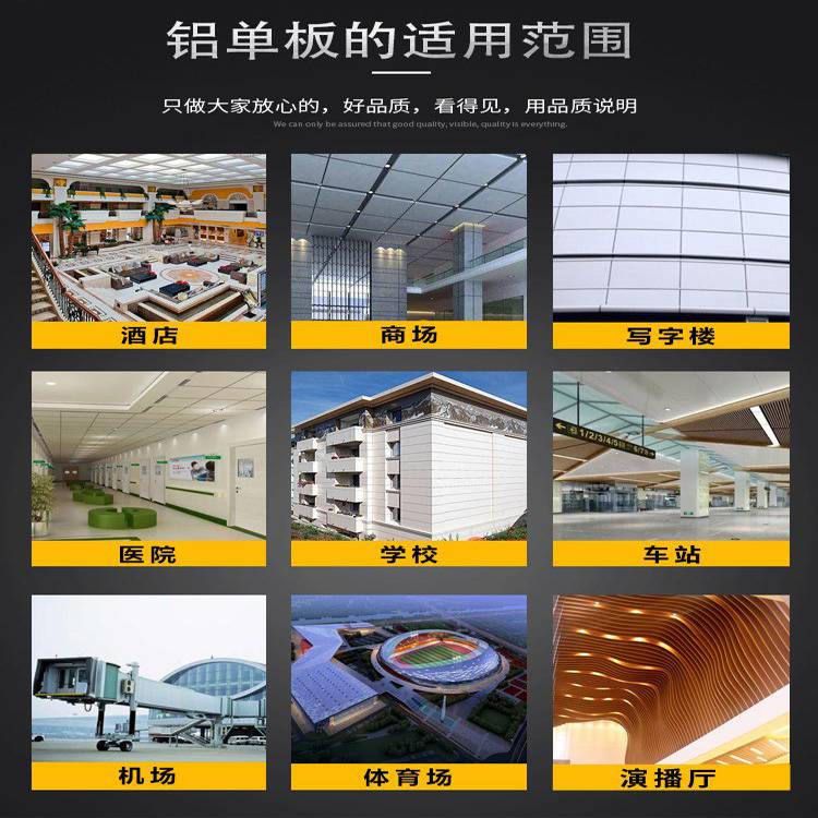 适用于各种建筑内外墙、门头、柱饰、背景墙、雨棚、高架走廊、人行天桥、电梯包边、阳台包装、广告指示牌、室内异形吊顶等的装饰。
