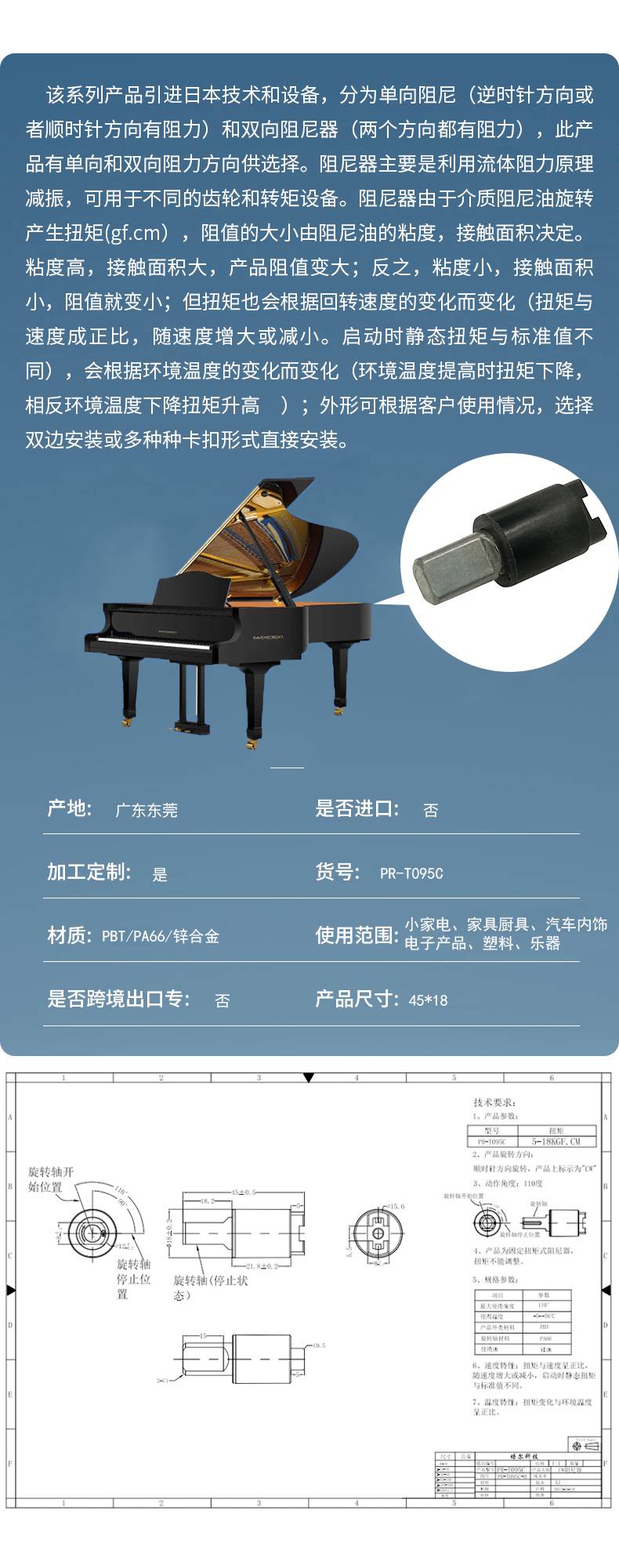 公司业务:主要专业从事阻尼器、缓冲器、门锁等研发、生产、销售的专业厂家。占地面积:现占地5600多平方米,拥有一批高素质的管理和技术专才。生产设备:引进日本生产检测设备,检测设备完善,拥有专业的研发设计,注塑装配团队。产品性能:可按客户要求定制各式产品,本公司生产的阻尼器性能稳定,品质卓越,在-40......
