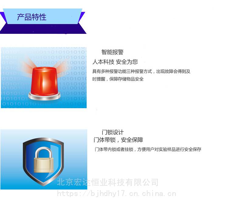 完善的报警系统,有声音蜂鸣报警及灯光闪烁报警功能,可实现超温报警、传感器故障报警、开门报警、远程报警、电源故障报警、制冷系统故障报警( 仅限HYC-260/360/610/940 产品)