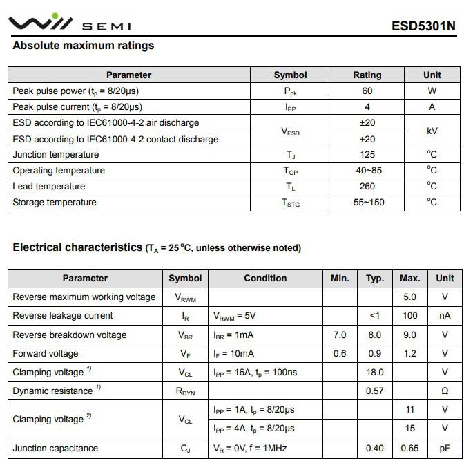 一:ESD静电二极管ESD5301N-2/TR容值0.65pF销售的参数: