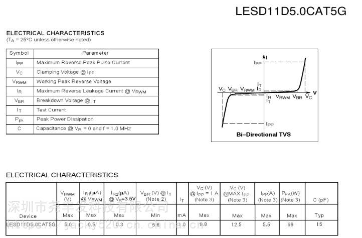 二:ESD静电二极管LESD11D5.0CAT5G电容15pF销售产品描述: