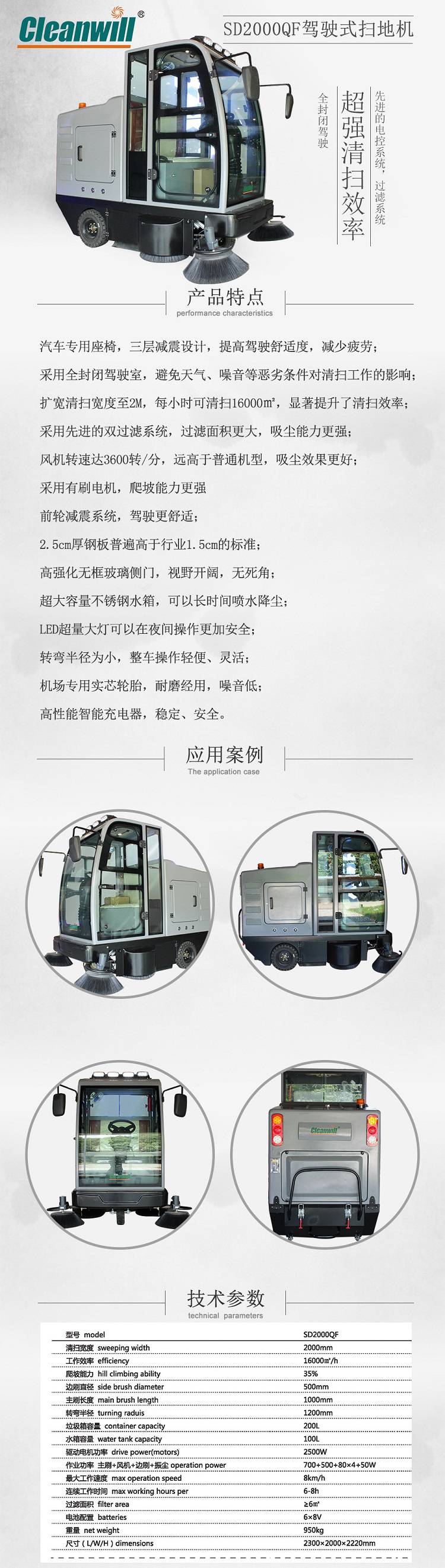 SD2000QF型为吸尘、扫地、喷水相结合的自动清洁一体机,采用封闭式驾驶室,为户外环境下使用。此款扫地机主要用于飞机场、公园、厂区、游乐园、广场等的室外清扫,是保洁物业公司的好帮手。