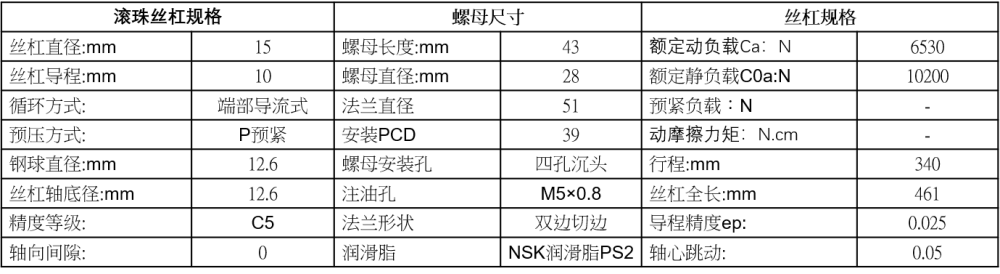 NSK滚珠丝杠PSS1510N1D0461,属于紧凑型FA系列PSS型丝杠,对应螺母类型是螺母类型BSS,需要填注NSK润滑脂PS2润滑剂,丝杠直径15mm,丝杠导程10mm,循环方式式端部导流式,螺母安装PCD是39,丝杠全长461mm,有效行程340mm,具体参数参见下表: