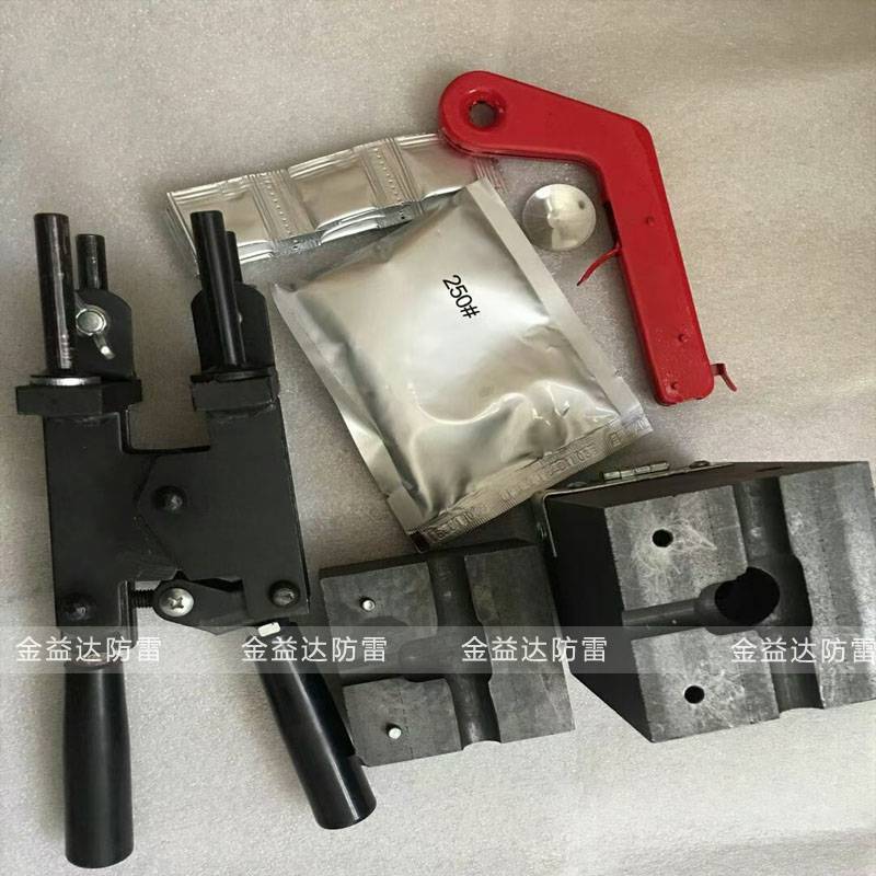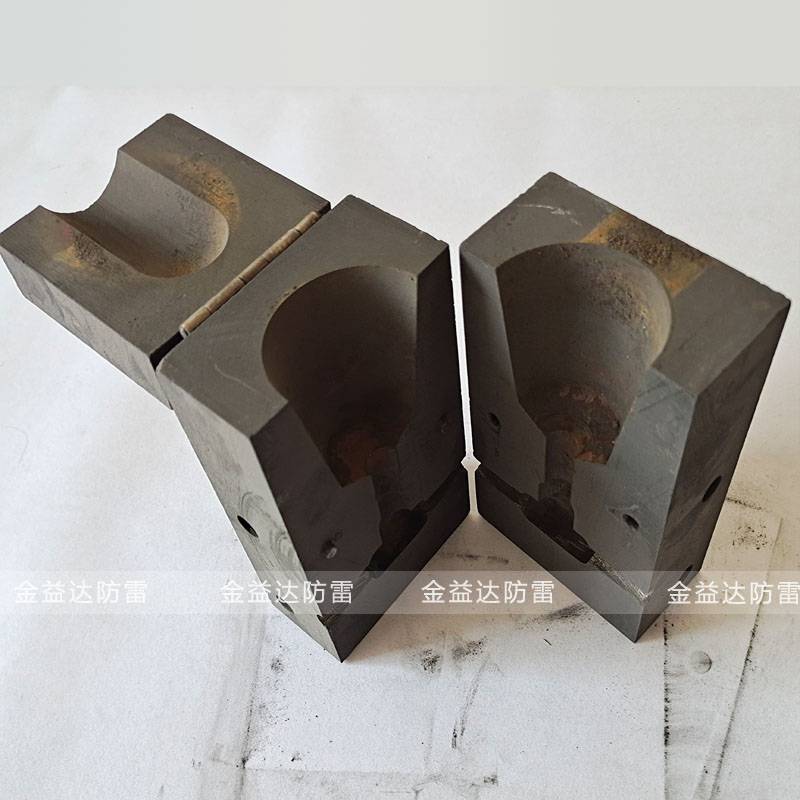 放热焊接模具由模具盖、模腔具、熔接腔、导流槽、模夹等几部分组成,能够承受铜、钢、铁等金属熔化温度,熔化金属流向、流速以及终形状经严密设计,通常模具寿命为80-200 次。放热焊接模具都需要使用模具夹配合使用,常规模具夹分为两种,标准型和偏心型,标准型适用于绝大部分模具,偏心型主要应用在焊接接地棒、十字焊接等需要避开焊接材料的类型上。部分型号模具使用中需要F型夹、C型夹等辅助夹具配合。