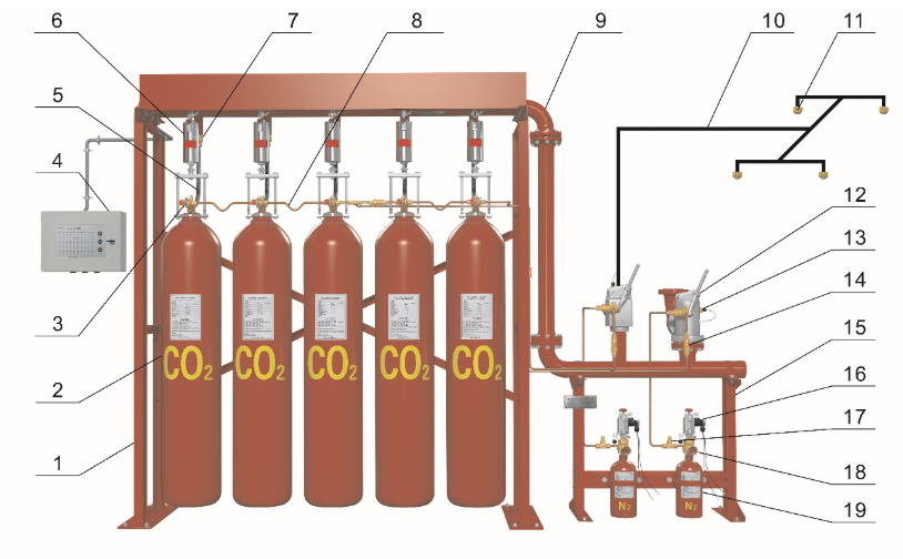 | 9.集流管 | 10.灭火剂输送管路 | 11.喷嘴 | 12.选择阀 |