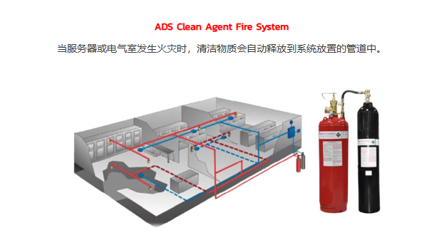当服务器或电气室发生火灾时,清洁物质会自动释放到系统放置的管道中。