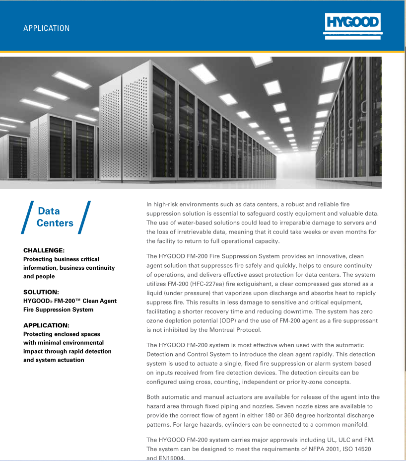 HYGOOD FM-200 系统被公认为为高价值资产、流程和位置以及在这些保护区工作的人员提供可靠和有效的消防解决方案