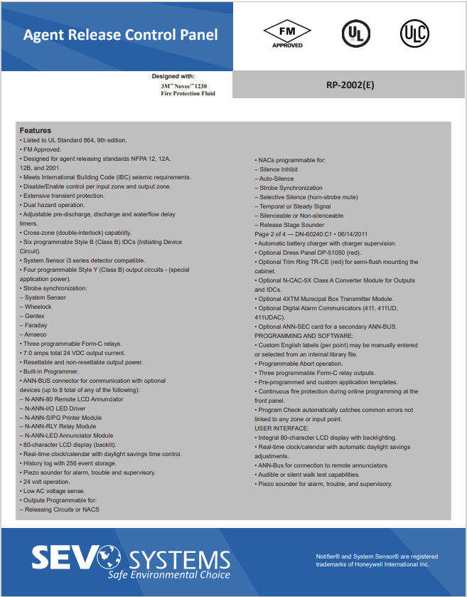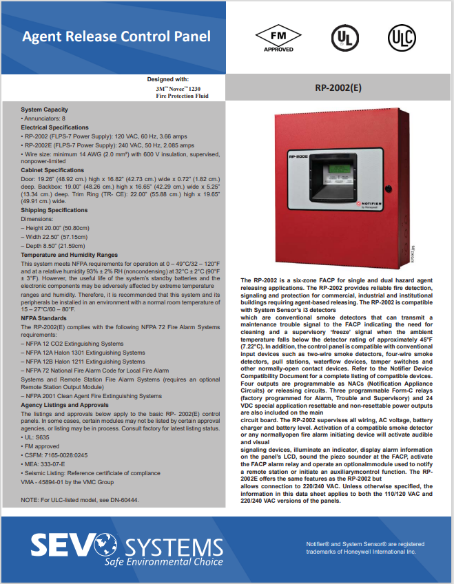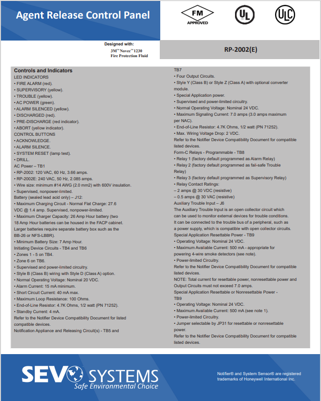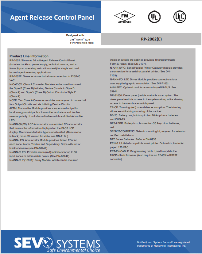 RP-2002 是用于单***剂和双***剂释放应用程序的六区 FACP。RP-2002为需要基于代理释放的商业、工业和机构建筑提供可靠的火灾探测、信号和保护。RP-2002 与系统传感器的 i3 探测器兼容。此外,电锥面板还与传统的输入设备兼容,如双线烟雾探测器、四线烟雾探测器、拉站、水流装置、篡改开关和其他正常打开的联系设备。主电路板上还包括三个可编程的 Form-C 继电器和 24 个 VDC 特殊应用可重置和不可重置电源输出。RP-2002 负责监督所有布线、交流电压、电池充电器和电池电位。***兼容的烟雾探测器或任何通常的开火报警启动装置将***可听和视觉信号设备,照亮指示器,在面板的 LCD 上显示报警信息,在 FACP 上发出Piezo 发声器的声音,*** FACP 报警继电器,并操作用于通知远程站或启动辅助控制功能的可选模块。