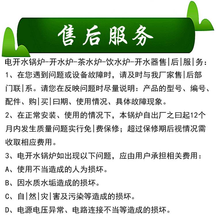 4、不锈钢内胆电开水炉保护环境。电锅炉不会排出如***、二氧化碳等***气体,无黑烟、灰尘,没有废物需要处理,没有污染,没有***、从环境保护角度来看,实为为优越。