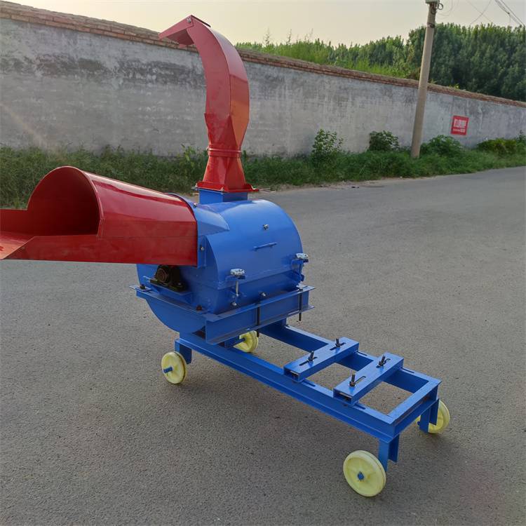 由电动机作为配套动力,将动力传递给主轴,主轴另一端的齿轮通过齿轮箱、万向节等将经过调速的动力传递给压草辊,当待加工的物料进入上下压草辊之间时,被压草辊夹持并以一定的速度送入铡切机构,经高速旋转的刀具切碎后经出草口抛出机外。