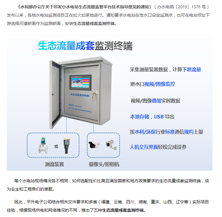 平升电子水电站生态流量遥测多媒体智能终端 小水电站流量远程实时测控终端结合相关文件要求和多省(福建、云南、四川、湖南、重庆、山西、辽宁等)实际项目经验,根据现场供电和网络情况的不同,推出了五种生态流量成套监测终端。实时监测水电站下泄流量数据,视频/图像监控泄水口实况,将现场信息远程传输至省级水利、环保监管平台,实现实时监管和数据共享。
