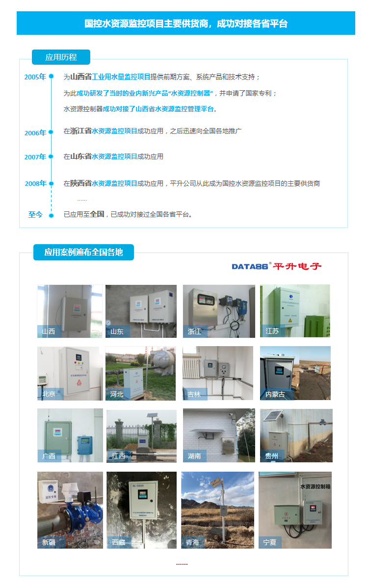 平升公司早在2005年就成功研发了“水资源控制器”,通过在“山西工业用水量监控项目”中的批量应用一举成名,之后一直在水资源监控领域深耕,经过多年的产品研究和项目经验积累,已拥有多款水资源取水计量监测设备,适用于各种取用水计量监测站,满足各类项目需求。