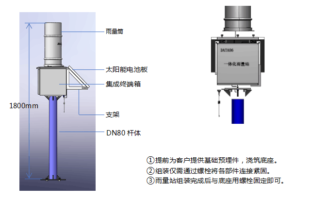 采用三段一体式结构,无需焊接,无需其他连接件,仅需10分钟,通过螺栓将雨量筒、终端箱、杆体、太阳能电池板等部件连接紧固即可轻松组装完成。