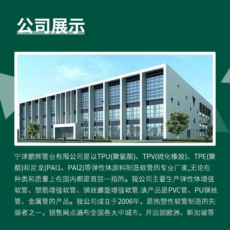 宁津鹏辉管业有限公司是以TPU(聚氨酯)、TPV(硫化橡胶)、TPE(聚酯)和尼龙(PAl1、PAl2)等弹性体原料制造软管的专业厂家,无论在种类和质量上在国内都是首屈一指的。我公司主要生产弹性体增强软管、塑筋增强软管、钢丝螺旋增强软管.该产品是PVC管、PU钢丝管、金属管的产品。我公司成立于200......