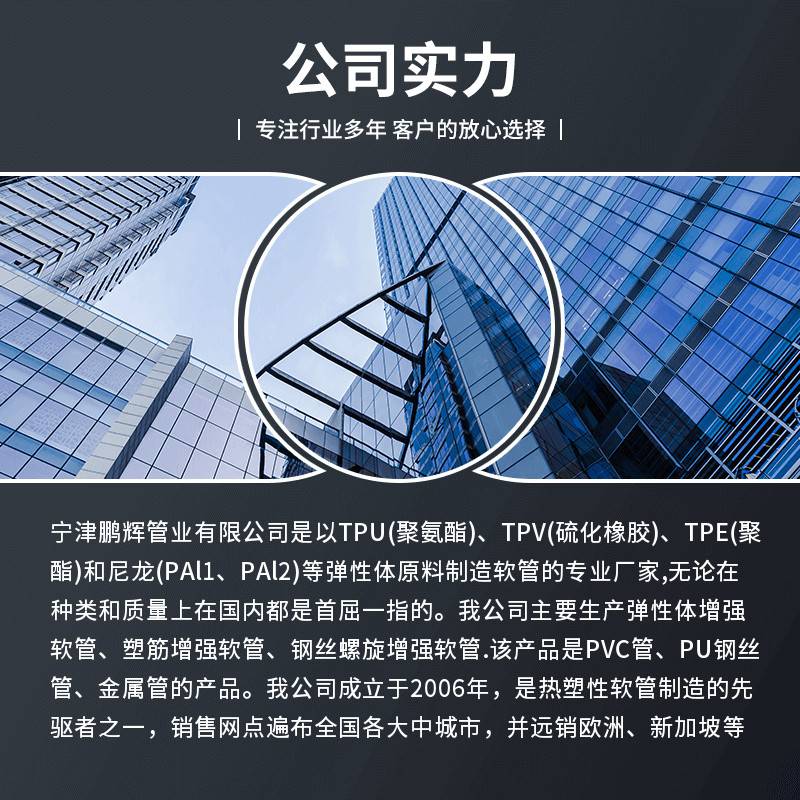 宁津鹏辉管业有限公司是以TPU(聚氨酯)、TPV(硫化橡胶)、TPE(聚酯)和尼龙(PAl1、PAl2)等弹性体原料制造软管的专业厂家,无论在种类和质量上在国内都是首屈一指的。我公司主要生产弹性体增强软管、塑筋增强软管、钢丝螺旋增强软管.该产品是PVC管、PU钢丝管、金属管的产品。我公司成立于200......