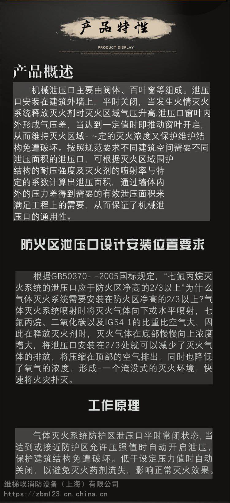 依据《气体灭火系统设计规范》G***370要求防护区需要开设泄压口。气体灭火系统启动时,气体灭火剂喷入防护区内,会显著地增加防护区的内压,如果没有适当的泄压口,防护区的围护结构将可能承受不起突然增长的压力而遭***。除此之外,火灾燃烧产生的热量也会使室内空气压力有所升高。在喷放时火势越大,时间越长,空气压力升高的值就越大。因此,《气体灭火系统设计规范》G***370要求防护区围护结构(含门窗)承受内压的允许压强(内外压强差)不宜低于1200Pa。防护区围护结构承受内压的允许压强,应由建筑、结构***设计给出。
