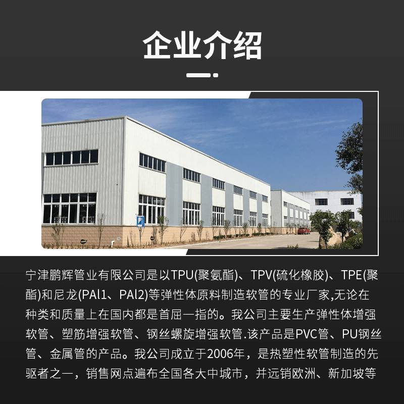 宁津鹏辉管业有限公司是以TPU(聚氨酯)、TPV(硫化橡胶)、TPE(聚酯)和尼龙(PAl1、PAl2)等弹性体原料制造软管的专业厂家,无论在种类和质量上在国内都是首屈一指的。我公司主要生产弹性体增强软管、塑筋增强软管、钢丝螺旋增强软管.该产品是PVC管、PU钢丝管、金属管的产品。我公司成立于200......