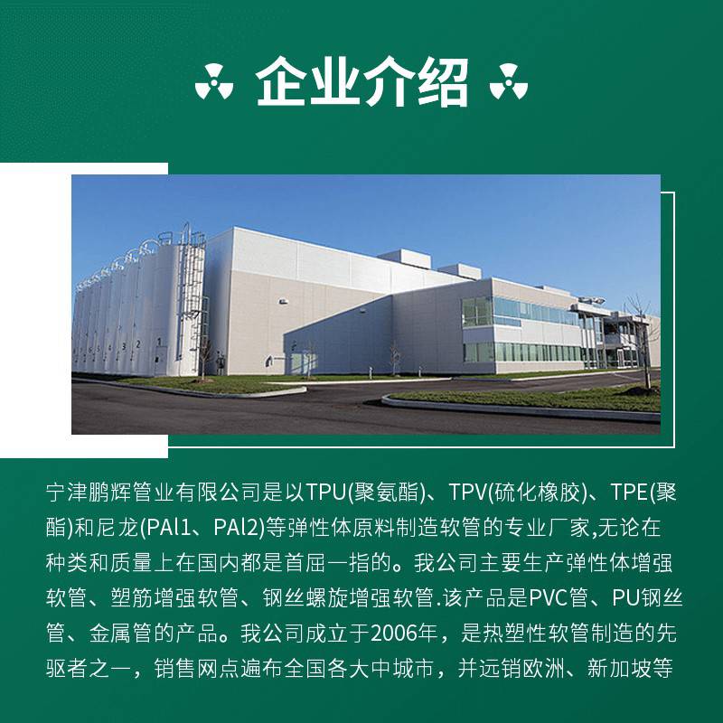宁津鹏辉管业有限公司是以TPU(聚氨酯)、TPV(硫化橡胶)、TPE(聚酯)和尼龙(PAl1、PAl2)等弹性体原料制造软管的专业厂家,无论在种类和质量上在国内都是首屈一指的。我公司主要生产弹性体增强软管、塑筋增强软管、钢丝螺旋增强软管.该产品是PVC管、PU钢丝管、金属管的产品。我公司成立于200......