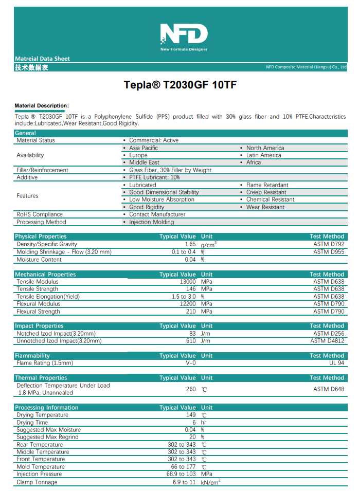 Tepla T2030GF 10TF是一种填充有30%玻璃纤维和10%PTFE的聚苯硫醚(PPS)产品。包括:润滑,耐磨,刚性好。