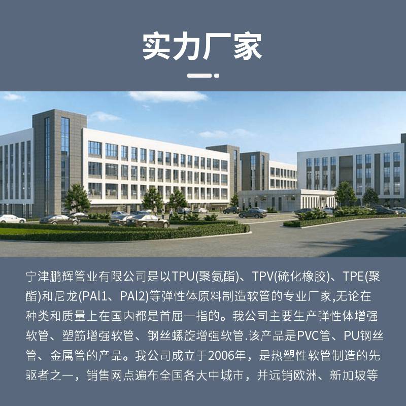 宁津鹏辉管业有限公司是以TPU(聚氨酯)、TPV(硫化橡胶)、TPE(聚酯)和尼龙(PAl1、PAl2)等弹性体原料制造软管的专业厂家,无论在种类和质量上在国内都是首屈一指的。我公司主要生产弹性体增强软管、塑筋增强软管、钢丝螺旋增强软管.该产品是PVC管、PU钢丝管、金属管的产品。我公司成立于200......