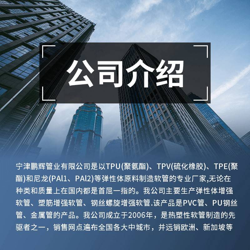 宁津鹏辉管业有限公司是以TPU(聚氨酯)、TPV(硫化橡胶)、TPE(聚酯)和尼龙(PAl1、PAl2)等弹性体原料制造软管的专业厂家,无论在种类和质量上在国内都是首屈一指的。我公司主要生产弹性体增强软管、塑筋增强软管、钢丝螺旋增强软管.该产品是PVC管、PU钢丝管、金属管的产品。我公司成立于200......