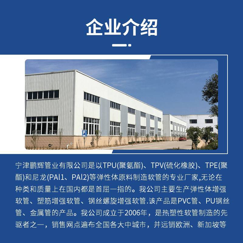 宁津鹏辉管业有限公司是以TPU(聚氨酯)、TPV(硫化橡胶)、TPE(聚酯)和尼龙(PAl1、PAl2)等弹性体原料制造软管的专业厂家,无论在种类和质量上在国内都是首屈一指的。我公司主要生产弹性体增强软管、塑筋增强软管、钢丝螺旋增强软管.该产品是PVC管、PU钢丝管、金属管的产品。我公司成立于200......